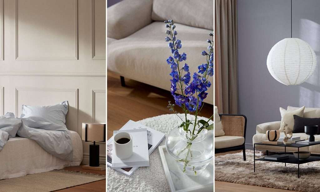 Även när det kommer till materialen är inspirationen hämtad från naturen och bland nyanserna hittar man förutom blåskalan även jordnära toner på allt från möbler och textilier till gardiner, mattor och sängkläder.