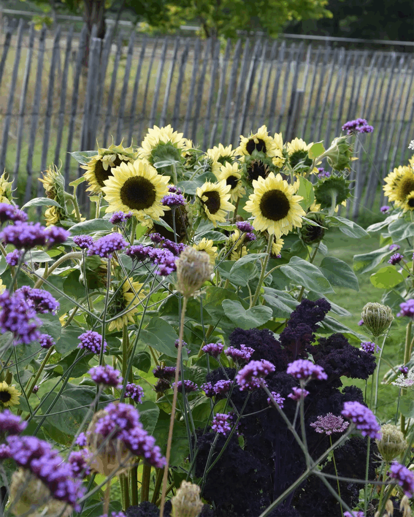 Blommor: Ringblomma, solros, tagetes, vallmo, luktärt, krasse, jätteverbena, zinnia, rosenskära.