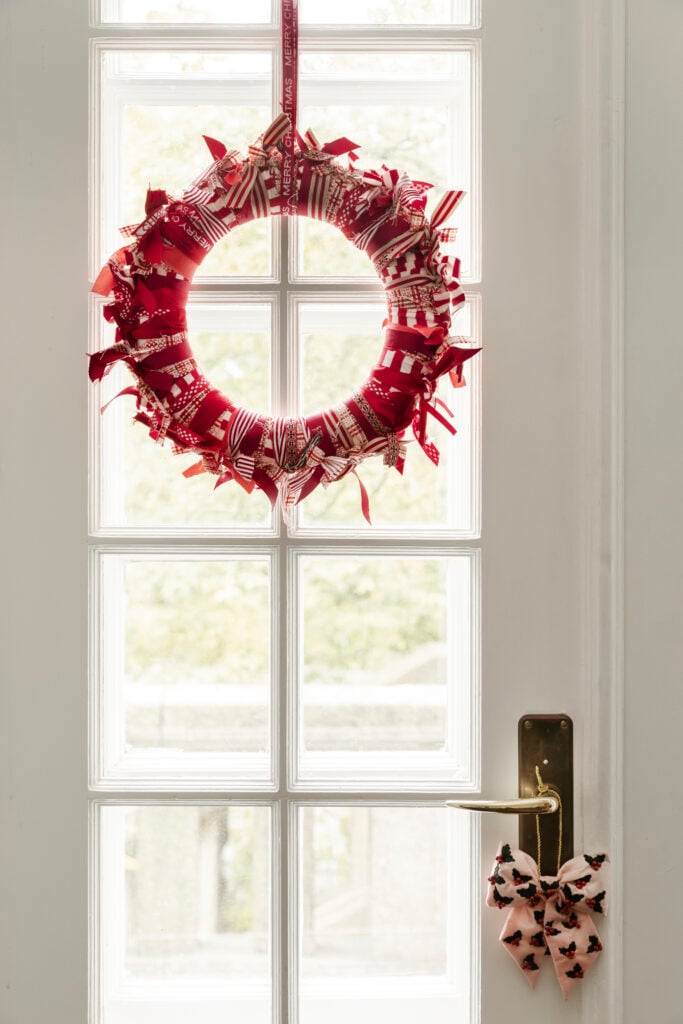 Samla ihop stuvbitar och gamla tyger. Klipp eller riv dem i smala remsor som kananvändas till att linda runt en julkrans. Du kan även använda vackra band om du har några liggande, kanske i jullådan från tidigare år? För ett mer stilrent intryck, använd gärna tyg och band i liknande nyanser.