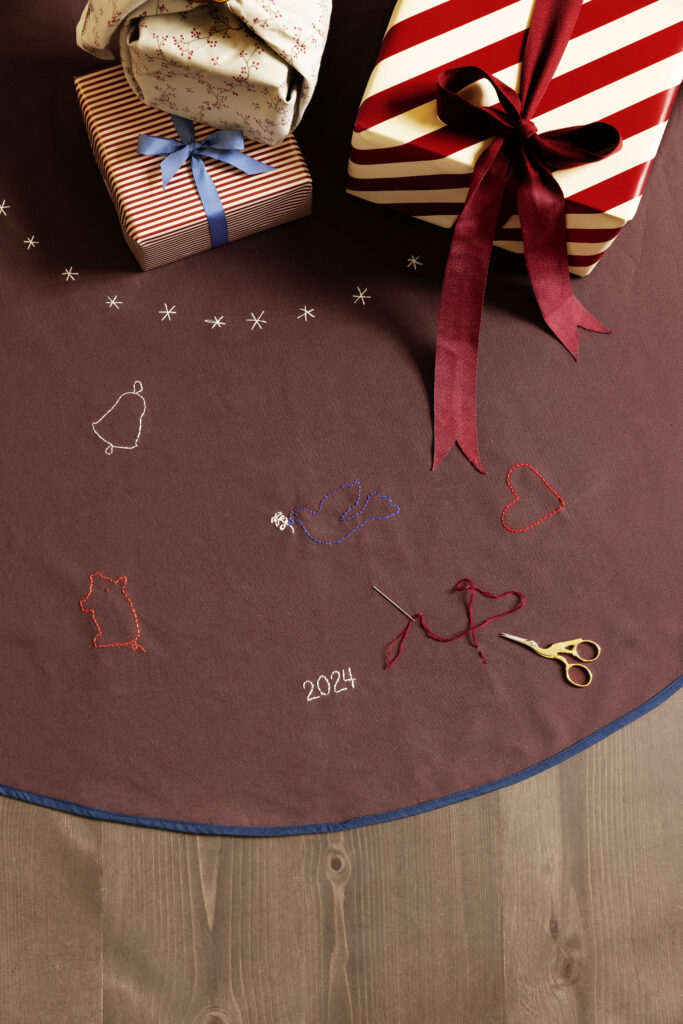 Skapa familjens alldeles egna, personliga julgransmatta med små broderier. Låt det vara ett pågående projekt, där nya motiv läggs till för varje år mattan används. Skissa upp motiven med en sypenna och brodera dem med stickstygn.