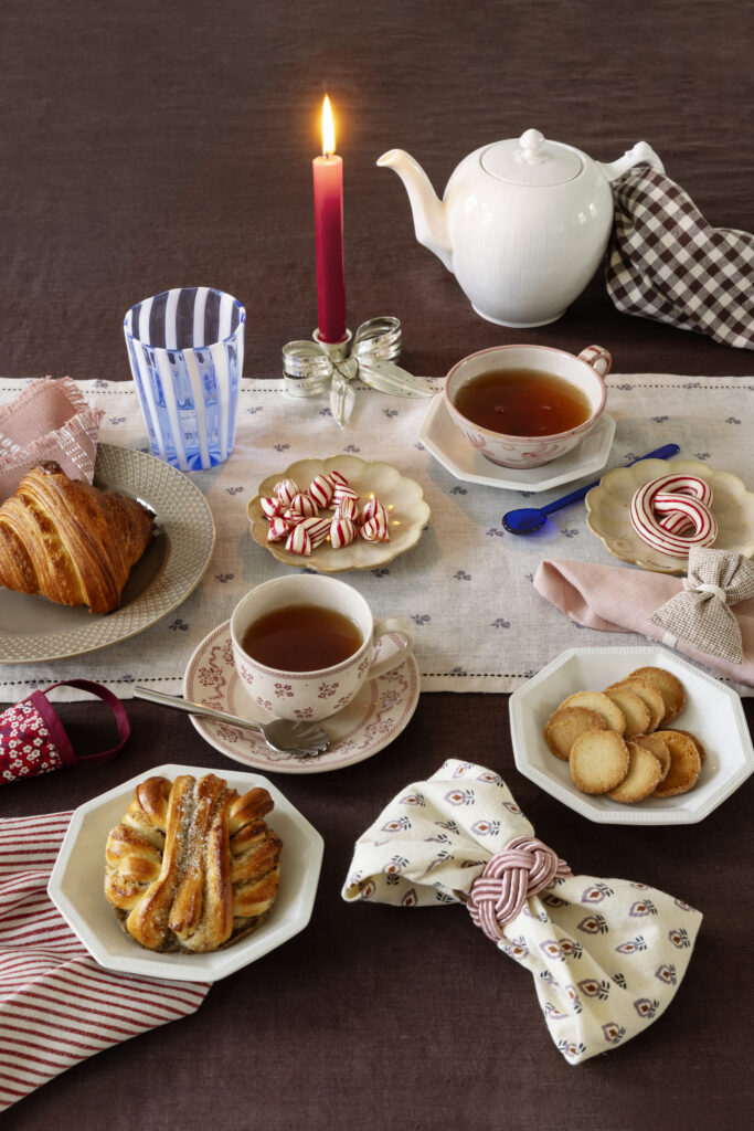 Textilier i vintermörkret skapar mys. På bordet får de gärna ligga i flera lager, som här där en jullöpare får ligga ovanpå duken. Duka med tygservetter i olika mönster och favoritporslinen för en avslappnad look.