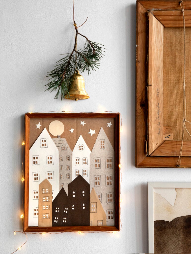 Skapa en vinterstad i en gammal ram och låt den bli en söt inredningsdetalj bland annat julpynt. Ta ut glaset och bakstycket ur ramen och skär till en bit kartong som passar i. Klipp ut hus i olika storlekar av papper i bruna och beiga nyanser. Rita upp fönster på husen och skär ut dem på ett underlag med en skalpell. Limma sedan fast husen på kartongen. Placera de större husen bak och de mindre längst fram för att få till perspektiven i bilden. Addera måne och stjärnor i vitt och ljusgult papper för en stilla stjärnklar natt.