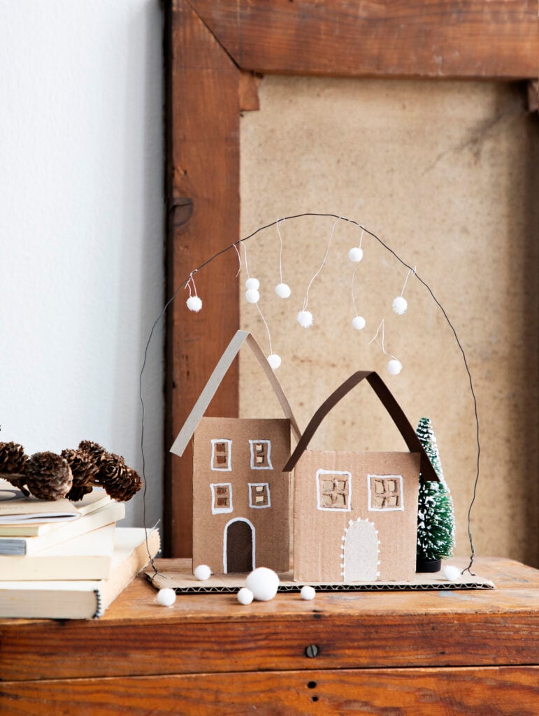 Skapa en julby där det snöar. Klipp ut en bit styv kartong som botten och gör hål i sidorna. Trä en bit ståltråd igenom från ena till andra sidan, så att den bildar en båge över husen. Klipp ut hus av kartong och rita upp fönster och dörrar. Skär ut fönstren med en skalpell mot en skärbräda eller annat lämpligt underlag. Klipp en 2 cm bred bit kartong eller papp, vik den på mitten, och limma fast ändarna i husens topp med limpistol. Limma fast husen på bottenplattan av kartong med limpistol, och placera en julgran bredvid. Fäst små vita kulor av bomull eller ull på ståltråden, och låt dem dingla över husen som snö som faller.