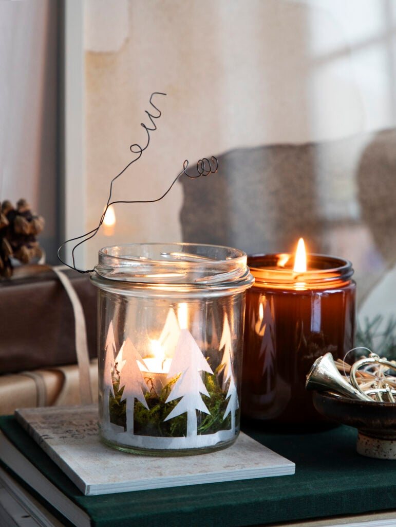 Börja med att klippa ut granar och hus i papper. Limma sedan fast dem på insidan av glaset. Lägg lite flamsäker mossa i botten för att skapa en illusion av mark och placera sedan ett värmeljus eller ännu hellre, ett elektriskt ljus inuti för ett varmt sken. För att addera en extra touch kan du vira en bit ståltråd runt glasets kant och vrida upp ändarna så de står som små handtag eller dekorationer. Det färdiga minilandet skapar julstämning och blir ett vackert stilleben.