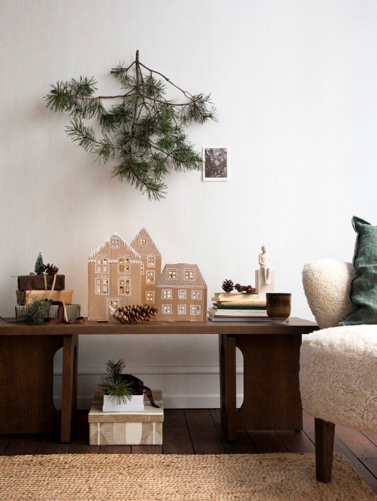 Hus i papper blir en charmig dekoration som håller fler jular än ett pepparakshus. Börja med att rita upp fasader i olika storlekar på ett pappersark i valfri färg. Skissa ut fönster och dörrar och skär sedan ut dem med skalpell mot ett lämpligt underlag. Markera fönstrens konturer med en vit märkpenna och rita även takpannor och andra fina detaljer. Klipp ut ett par fötter till varje hus och limma fast dem på underkanten så de kan stå själva. Avsluta med att addera en ljusslinga som ger ett mjukt sken inifrån fönstren.