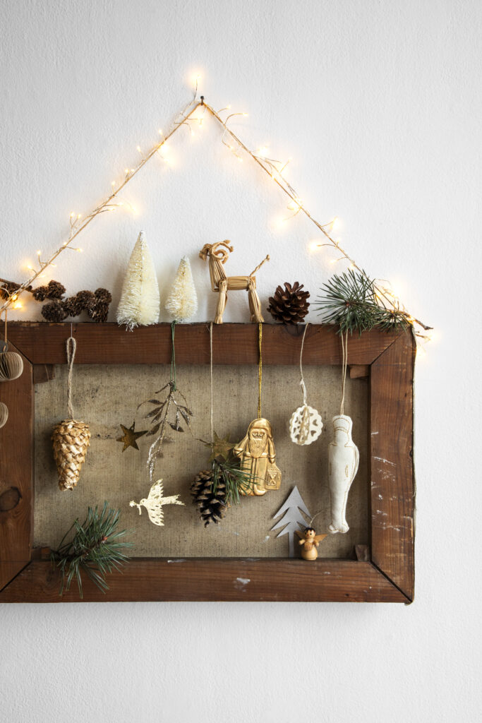 Fynda en gammal tavla med träram i en secondhandbutik och använd baksidan för att skapa en scen för pynt. Slå in ett par spikar längs ovansidan på ramen för att ha något att hänga pyntet på. Dekorera med att hänga upp dina favoriter och fäst mindre grankvistar, kottar och julbockar längs ramens kant med tejp. Häng upp på väggen, addera en ljusslinga och njut av ditt julstilleben.