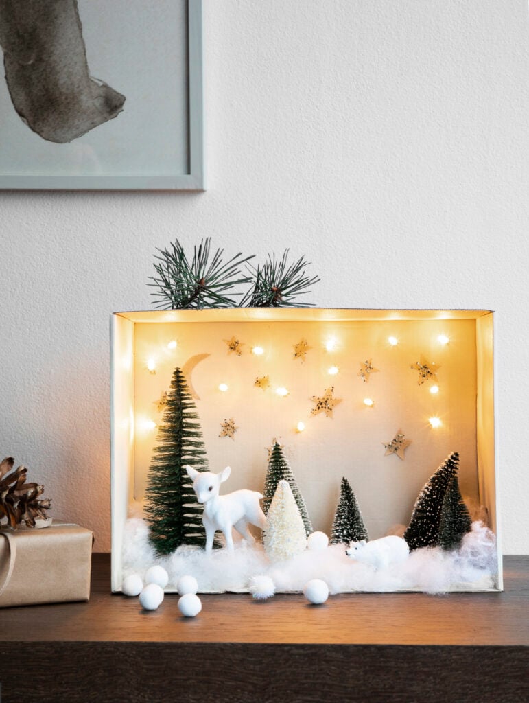 Låt sagan om Bambi ta form i en enkel skokartong. Börja med att måla kartongen invändigt för att skapa en vinterhimmel. Klipp ut måne och ett gäng stjärnor av papper. Strö ett lager glitter över dem och limma fast dem i kartongens botten. Gör små hål intill varje stjärna och stick försiktigt in lamporna från en ljusslinga du placerar bakifrån så sladdarna döljs. Ställ upp kartongen, skapa en bädd av vadd och låt dekorationsgranar och andra små djur göra Bambi sällskap i skogen.