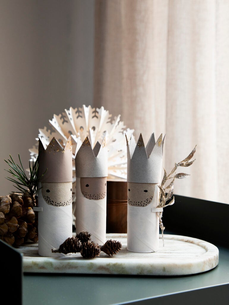 Pyssel av toarullar är en klassker! Börja med att skissa på rullarna med blyerts. Måla sen deras kläder. Skäggstubb och ögon ritar du med en tunn svart tuschpenna. Gör kronor av papper och limma fast lite glitter på toppen. Gör armar av en bit papper. Stick sedan igenom en stjälk, en grankvist eller ett glittrigt blad, så får de något att bära på.