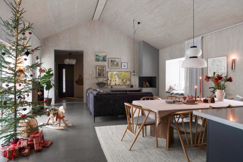 Familjens hem är som gjort för stora kalas. Kök och vardagsrum hänger ihop i en öppen planlösning med 4,20 i takhöjd. Väggar och tak kläs av plywood, något som Lydia till en början var skeptisk till.
