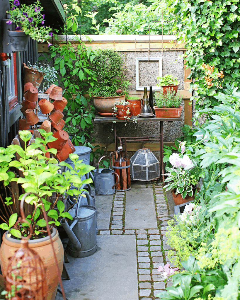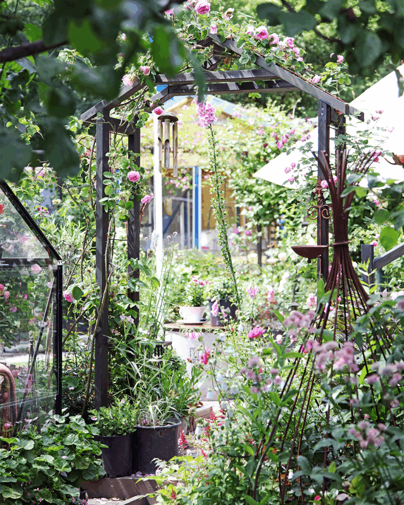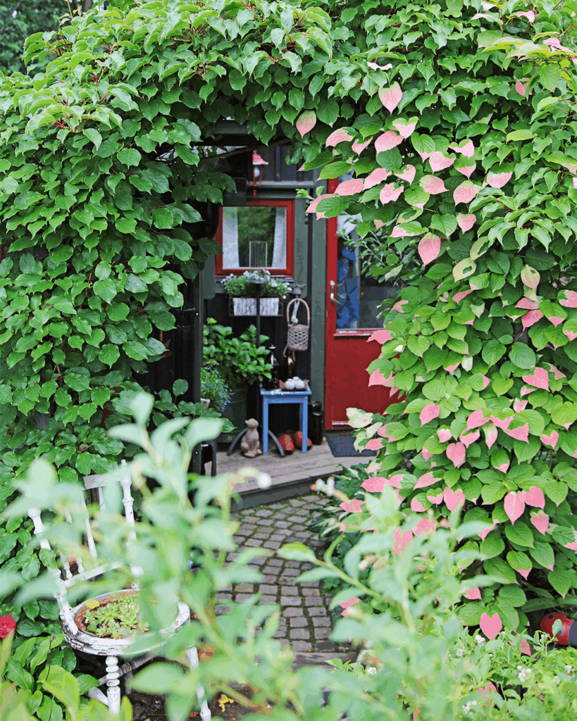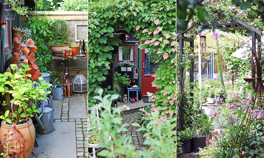 Det svarta huset är så inklätt av växtlighet att man egentligen bara ser konturerna, balkongen och verandan – ett sagohus i en sagoträdgård. Trots att tomten är liten tar det tid att gå upp till huset för det finns mycket att titta på. Varje meter är en ny upplevelse med växter, stilleben, färg och form. Att tomten lutar 1, 5 meter bidrar till spänningen, och alla små rum är avdelade med portaler som gör att man bara ser en bit av trädgården i taget. Var portal har sin växt: murgröna, minikiwi, kaprifol, vinranka och så rosor förstås.