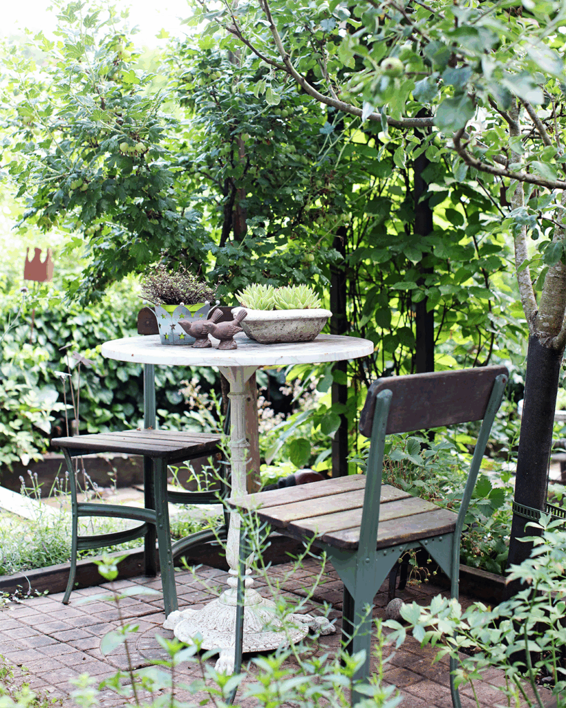 Högst upp närmast entrén öppnar sig trädgården med en rund gräsmatta kring flaggstång med vajande vimpel och sittplatsen med levande tak där man kan vara många. Totalt finns sex sittplatser utomhus, plus lillstugan, växthuset och inomhus.