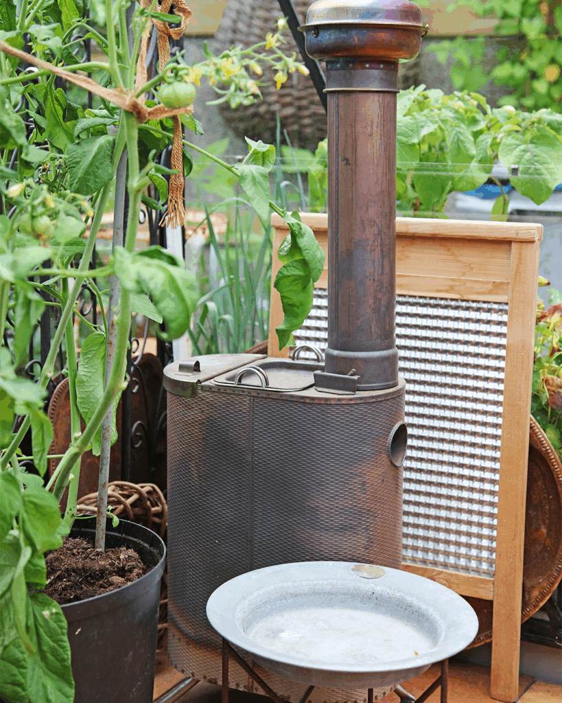 När man tittar lite närmare har det smugit sig in finurliga lösningar lite här och där. De rostiga ytterkrukorna som ingår i olika grupper skvallrar om Tommys motorintresse: det är broms-ok i olika storlekar från både bilar och större fordon, en del på ben, andra direkt på marken.