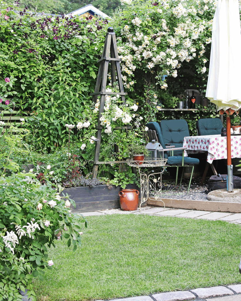 Längst ner på gatan där vägen tar slut svingar sig den överdådiga klängrosen ’Valdemar’ över ingången till Meta och Tommys kolonistuga. Här finns rosor i alla de färger, vanliga och ovanliga och mängder av andra växter, men det speciella är ändå hur de lyckats få 300 kvadratmeter att kännas som 3 000.