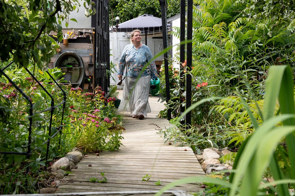 – Jag ägnar mycket tid åt att sitta här och njuta av trädgården och dagen, säger hon från sin fåtölj, som står under ett tak här i trädgården tillsammans med andra mjuka möbler.