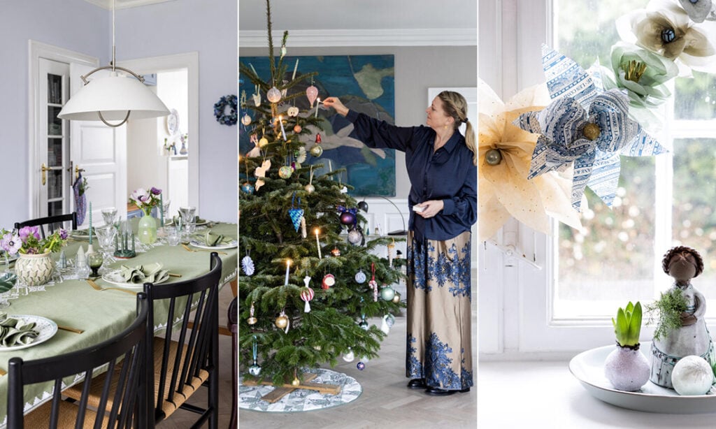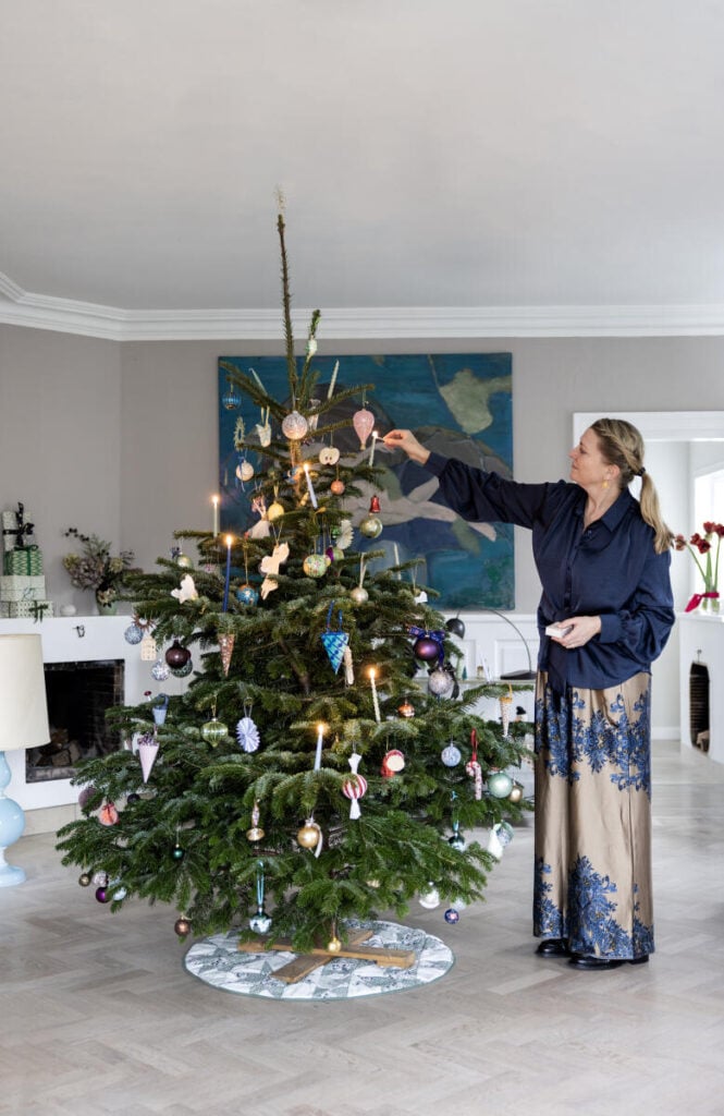 Förutom bordsdukningen älskar hon också att pynta julgranen, alltid med en fin blandning av nytt och gammalt från lådan med julpynt.