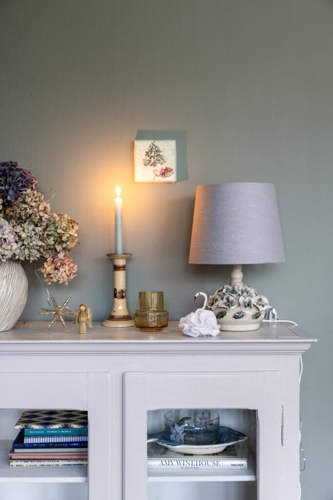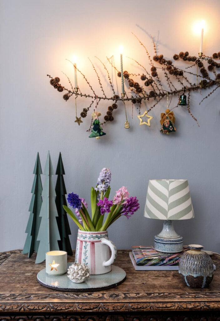 Mette Kirstine gillar att pynta olika från år till år. Varje jul läggs något nytt till i hennes jullåda, helst något från secondhandbutiker eller julmarknader. Hon gillar också att ha gott om tid för julaktiviteter under advent, eftersom hon gillar att göra pynt själv.