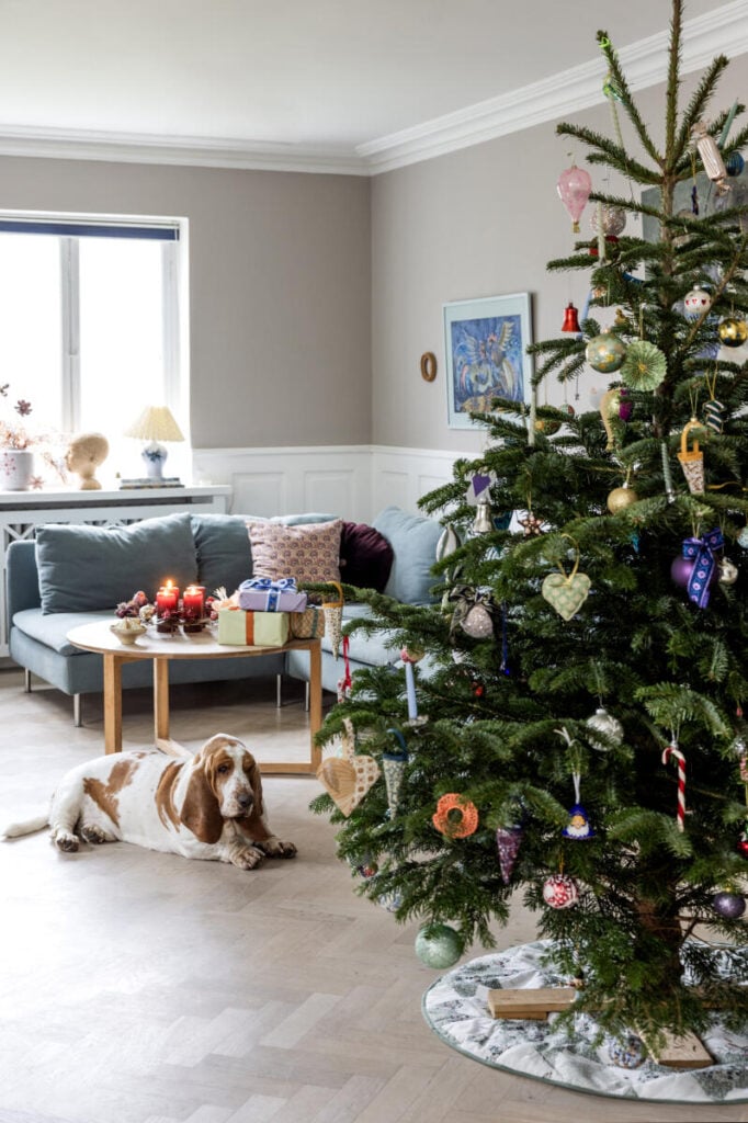 – Vår julgran är en blandning av färger och både rustika och vackra saker, hemmagjort pynt och mina favoriter – pojkarnas pappersänglar, som de gjorde i 1:a klass. Vi måste se till att inte hänga pynt av tyg eller papper längst ner på granen, för då tar hunden dem. Men annars är det bara att hänga upp pyntet efter eget önskemål. Familjen är inte helt nöjd med vår miniatyr-julstjärna, så jag har lovat att leta efter en stor och fin stjärna till granen i år, avslutar hon.