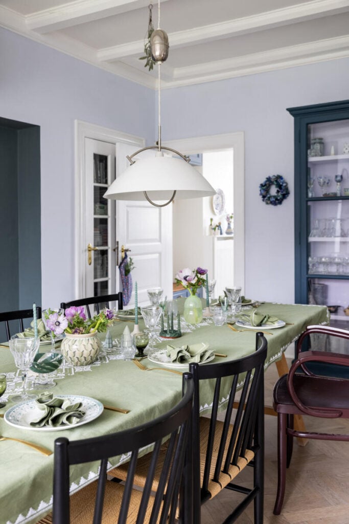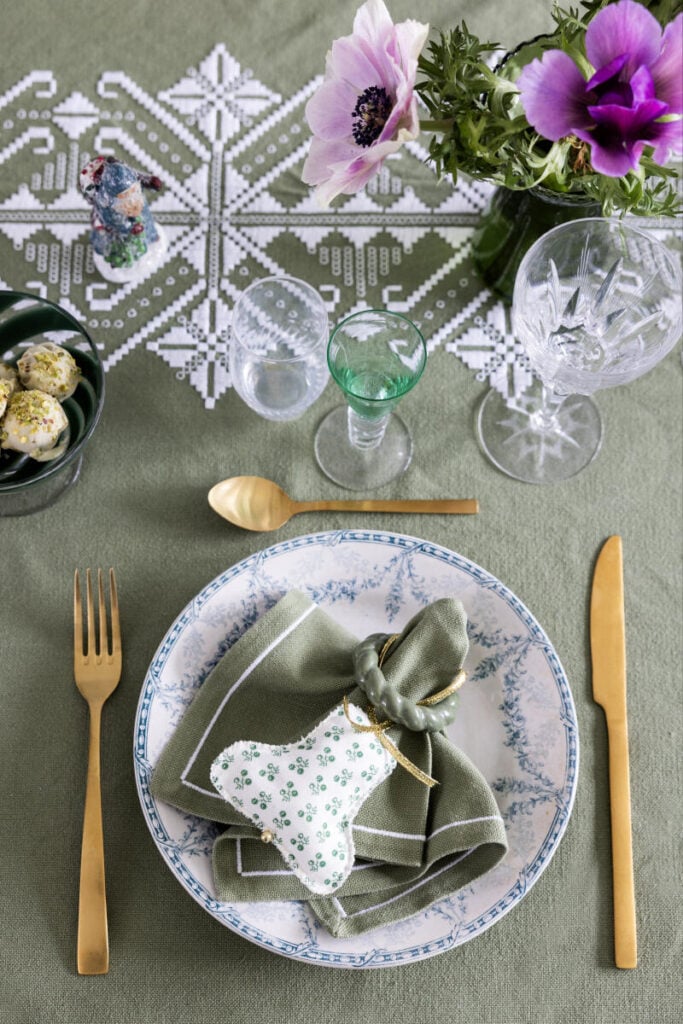 För Mette Kirstine är bordsdukningen väldigt viktig på julafton, och hon ser alltid fram emot att tänka ut en annorlunda och vacker komposition. I år är det dukat i grönt med matchande keramik, vintagetallrikar och franska anemoner.