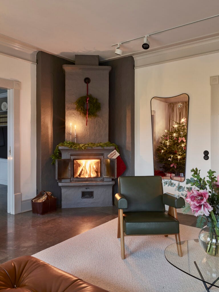 Julpyntet går i klassisk stil, röda toner och mycket grönt. Detaljer som granris, röda julkulor och barnens julstrumpor bidrar till den varma känslan.