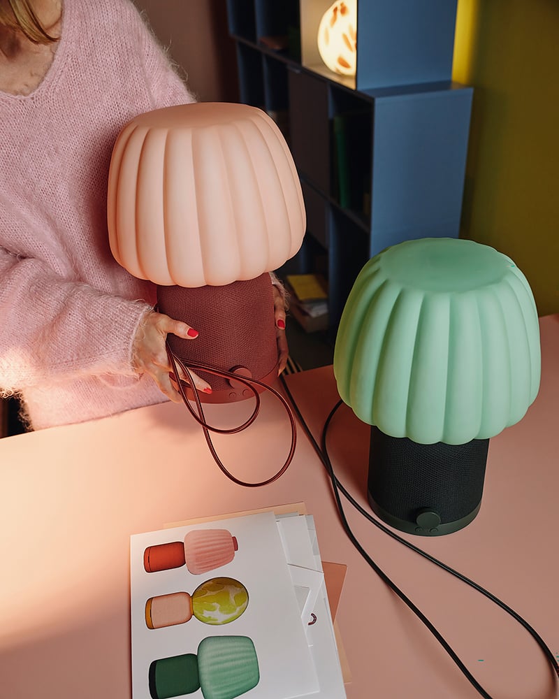 Kollektionen innehåller även Kulglass, två lamphögtalare i nyanser av grönt och rödbrunt med rosa, som förenar ljus, ljud och färg.