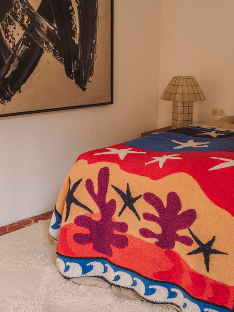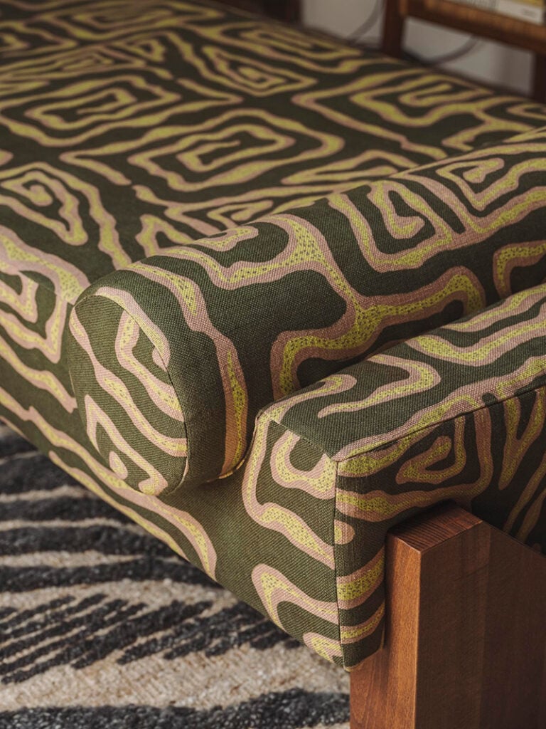 Den färgstarka, mönstrade och taktila känslan går som en röd tråd genom kollektionens alla delar, från de handtuftade mattorna till plädarna och nya klädslarna till Dusty Decos soffa Lola och V-daybeden.