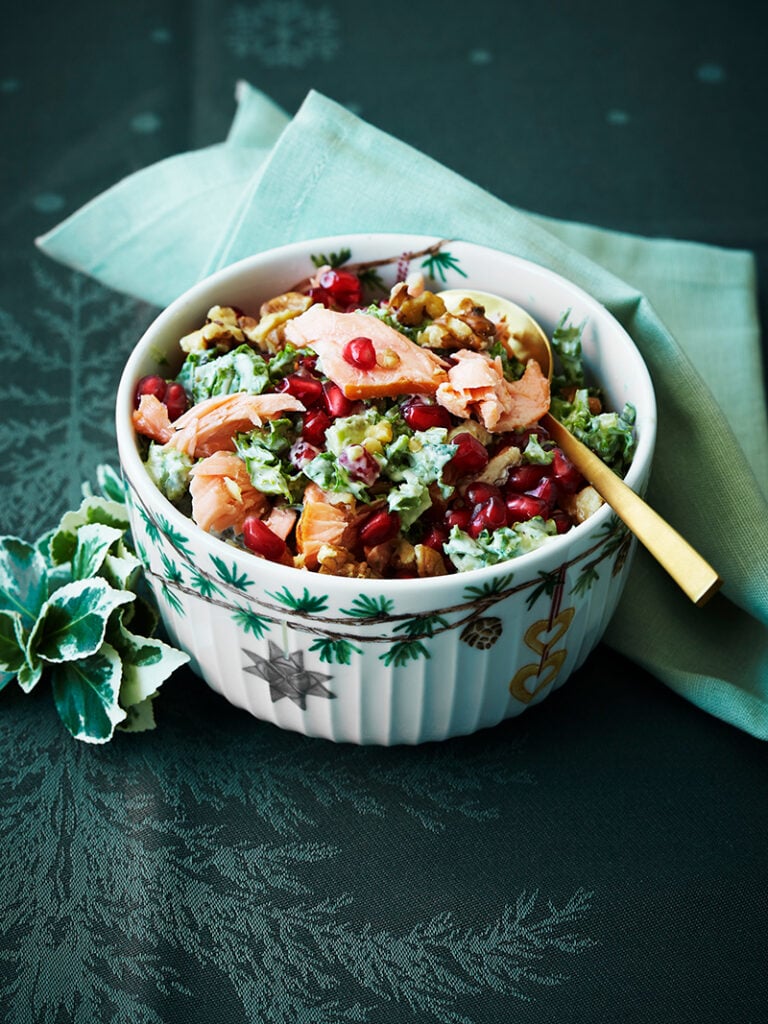 4. Fördela laxen över och strö över nötter. Servera gärna salladen med baguette.