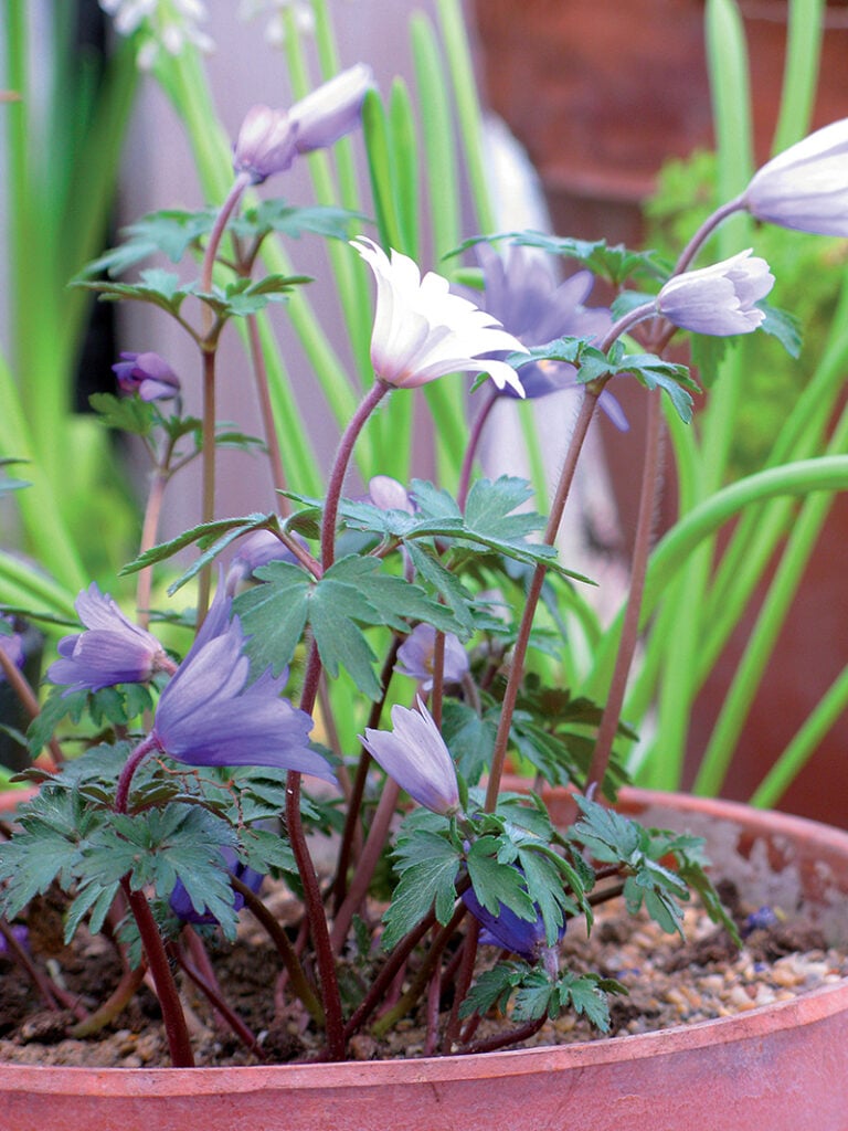 Bukettanemonen blommar på våren vid Medelhavet. Har man tur kan man hitta den på kruka även här hemma i början av året. Den är känslig mot kyla men blommar fantastiskt vackert och länge. Om man planterar lökar på våren tar det cirka tre månader innan de blommar. Låter man krukan stå inomhus så går det lite fortare. Anemoner behöver fukt efter plantering och vill ha kalkrik jord. Bukettanemon på kruka trivs i soligt läge men tål inte frost.