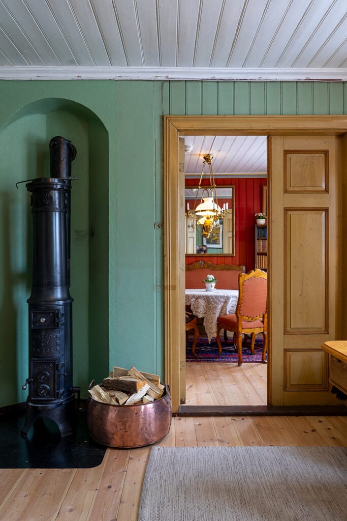 Familjen behövde en ny och stor vedugn i huset och valde en gjutjärnskamin. Den gula färgen på väggarna är linoljefärg, kod 2020-Y10R, medan dörrarna är målade i originalfärgen 2020-G80Y. All panel är original. Den vita färgen är också linoljefärg med färgkod: 1005-Y10R.Finrummet används mest till födelsedagsfiranden, eller när någon behöver en lugn vrå för att läsa. Familjen brukar flytta ner TV:n till finrummet under julen. Då är det så mysigt att se julfilmer tillsammans medan granen lyser mitt i rummet.