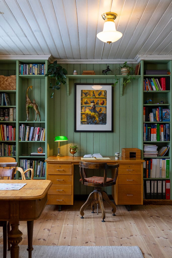 Øystein har tillverkat ny köksinredning i ask och furu. Väggarna är målade med linoljefärg, kod 3030-Y70R.Matsalen ligger precis intill köket och används till alla måltider. Kontoret var också en del av länsmanskontoret. Vägguret tillhörde gården och hänger på sin gamla, fasta plats. Stolen tillhörde Marits farfar.Det gröna rummet lämpar sig väl som kontor och har också varit det tidigare. Här har Marit och Øystein endast skurat med väggarna med linoljesåpa och sparat all originalmålning. Ett nytt golv lades också här. Det gamla golvet var mycket ojämnt, och det fanns en glipa nere vid golvlisten rakt ut i 35 minusgrader!