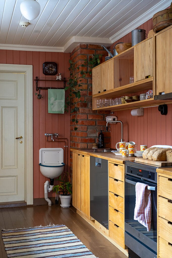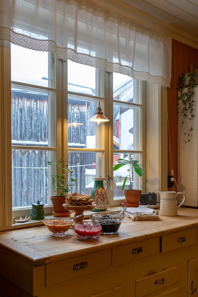 Genom att utvidga öppningen mot förrådet har familjen fått en stor och rymlig garderob i anslutning till hallen. Detta var viktigt att göra för att huset skulle passa en familj med tre barn och en hund. Trappan och golvet i hallen är målade med brun äggoljetempera, Ovolin (10 390 är färgkoden). En färg som Marit tycker mycket om. Här var det viktigt med en färg som torkade snabbt, och linoljefärg var inte ett alternativ.Den gamla köksbänken var fortfarande intakt när paret köpte huset, och den har de valt att behålla med originalmålning. En ny bänkskiva har Øystein tillverkat av golvplankorna från ”gammelköket” på första våningen. Det har nu blivit en tvättstuga.För lite över tre år sedan flyttade familjen in i Opdalgården på Bergmannsgata i Røros där de alla stortrivs. Överst på Bergmannsgata byter gatan namn till Mørkstugata, där denna bild är tagen.