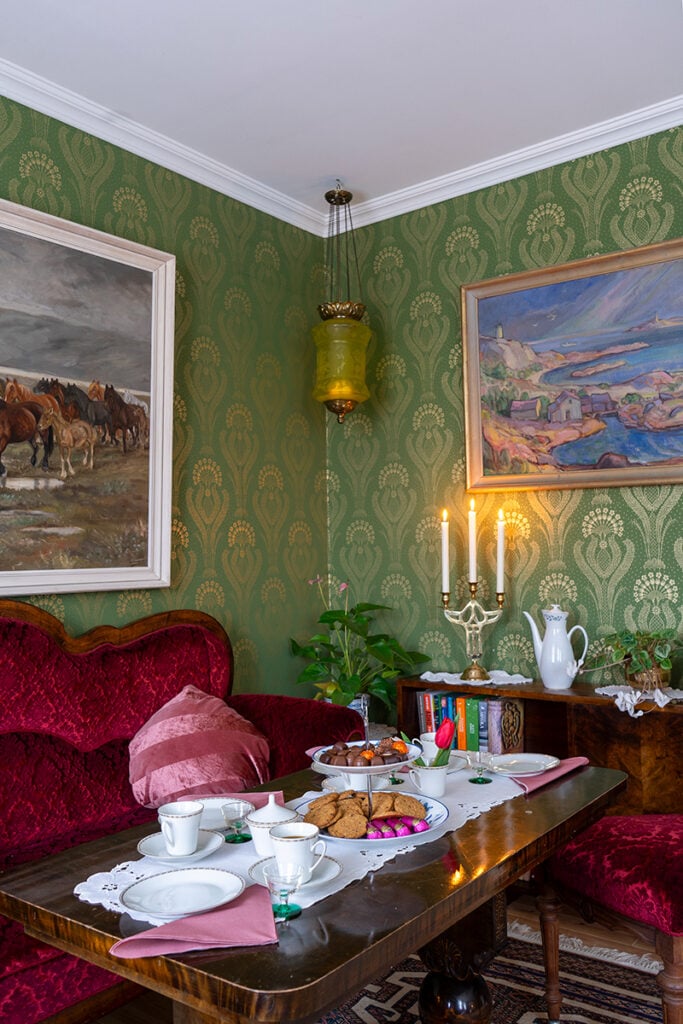 – Jag tycker att de gamla sakerna ska användas, vad är poängen med den vackraste ”krusidull-kannan” om den bara ska stå och damma långt inne i ett skåp, säger mamma Marit när hon dukar bordet i den gulmålade matsalen. Ett rum som hon och hennes man Øystein omsorgsfullt har restaurerat med tanke på att bevara så mycket som möjligt, och dessutom skapa en fin ram runt vardagslivet med tre aktiva pojkar.
