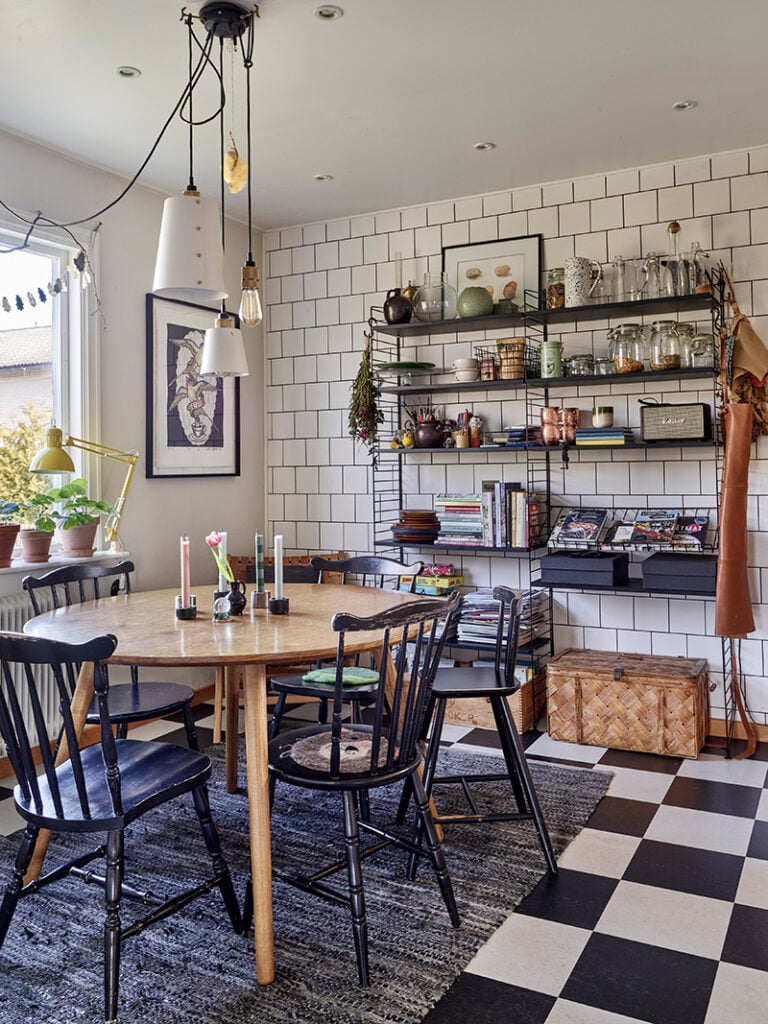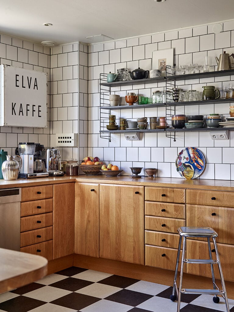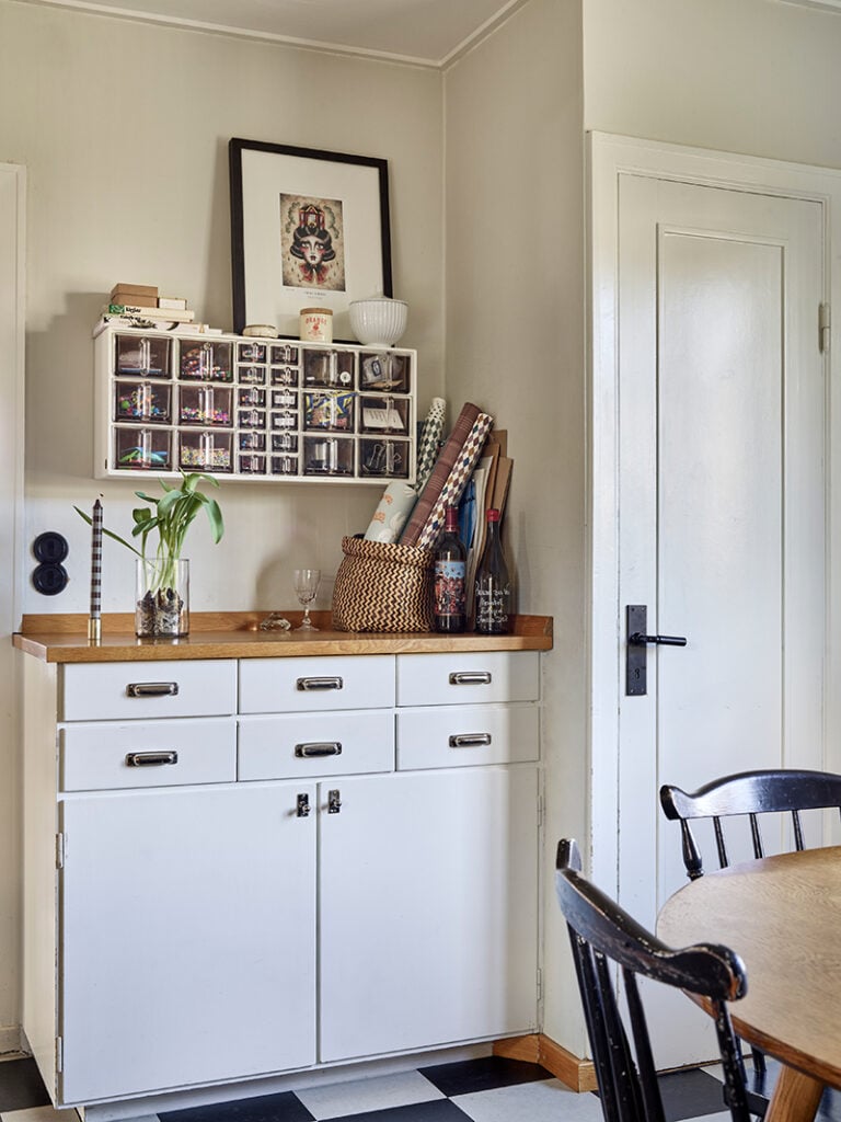 Den första tiden gick åt till att fräscha upp ytskikten. Istället för att byta ut det solida köket i ek valde de att ta ner överskåpen och göra nya lådfronter >> av överskåpens luckor, och bytte knoppar och handtag. De har kaklat om och bytt ut golvet som var någon slags imitation av stenplattor mot ett mer tidsenligt schackrutigt golv. Efter det har de renoverat i omgångar.