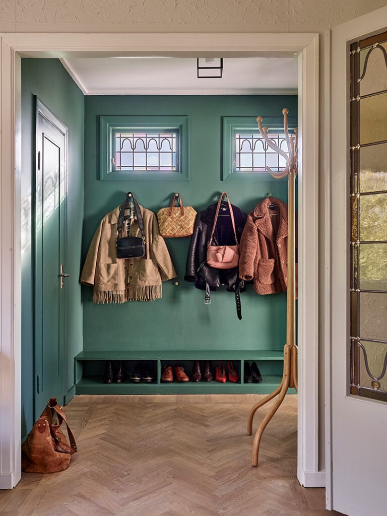 Smidesdetaljerna i trappräcket är av samma sort som finns i staketet utomhus mot vägen. En rolig detalj som visar att här är det någon som har tänkt till! Byrå från Jysk, trälådan är arvegods och hattaskarna är från Granit.