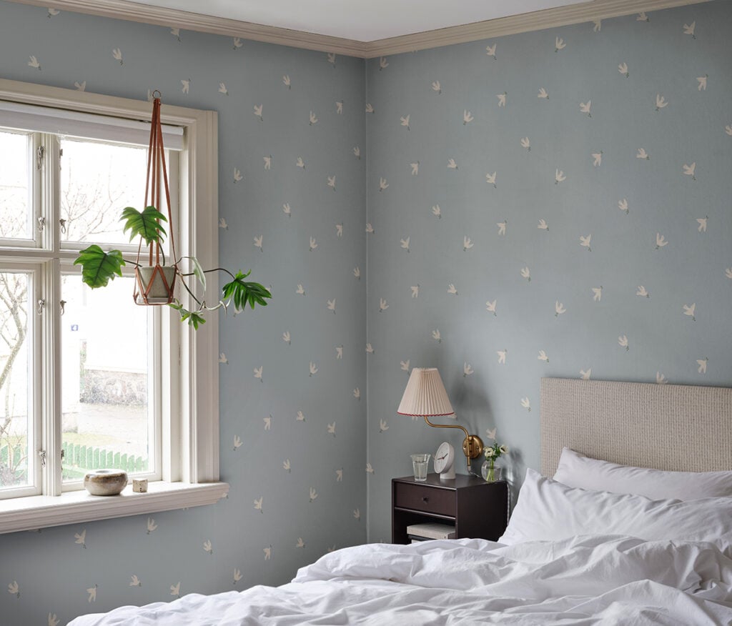 Bädda för en god natts sömn med nyheten ”Frida” från Sandberg. Det söta motivet med små duvor känns luftigt och inte alltför tätt i mönstret, perfekt för din lugna plats.