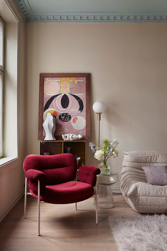 Behöver vardagsrumsväggen några strykningar med färg, eller kanske en helt ny färg i taket? Här är taket målat i färgen Le Ciel, en ny färg framtagen av magasinet Elle för Alcro. Fåtöljen ”Bollo”, designad av Andreas Engesvik, i en specialdesignad röd sammetsvariant för tillfället, lyser upp och tillför rummet en extra piff.