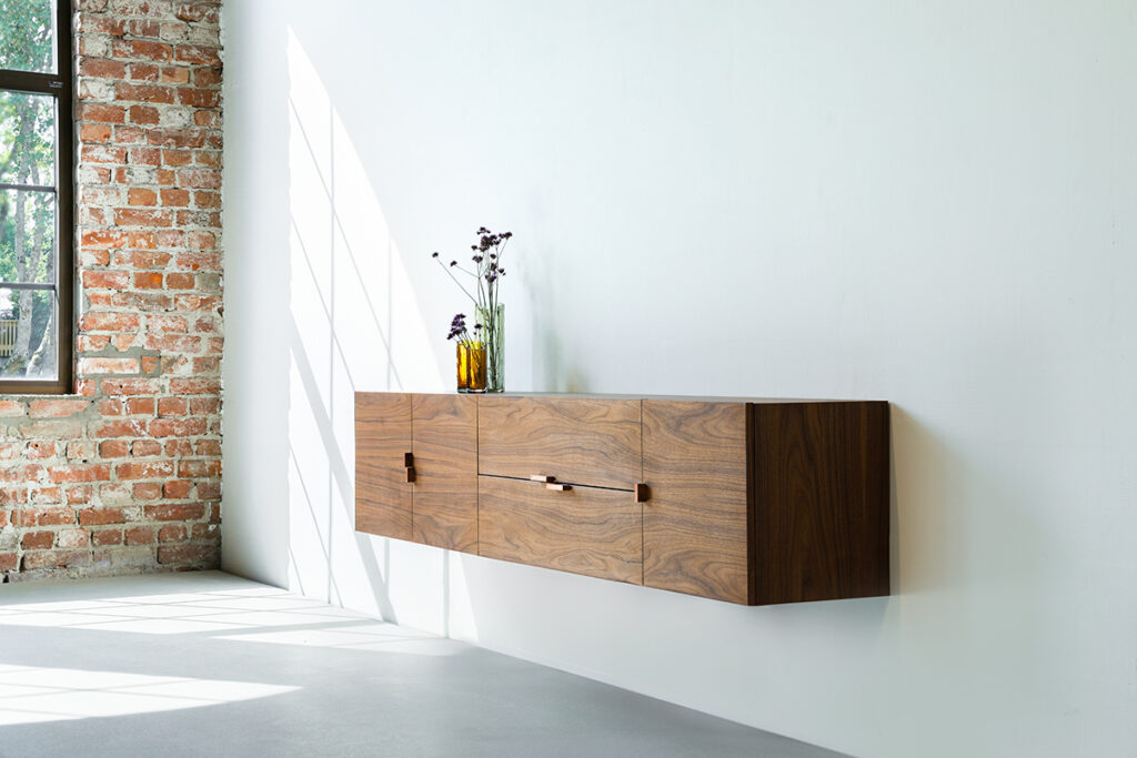 ”L1 Wall cabinet” är en vacker, vägghängd skänk i fanerad valnöt med beslag i koppar, som kommer att bli som ett smycke på väggen, l 200 x b 35 x h 40 cm, 58 000 kr, Krafted.