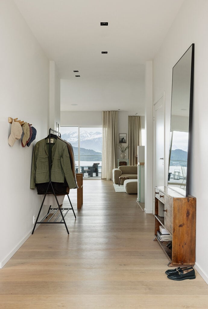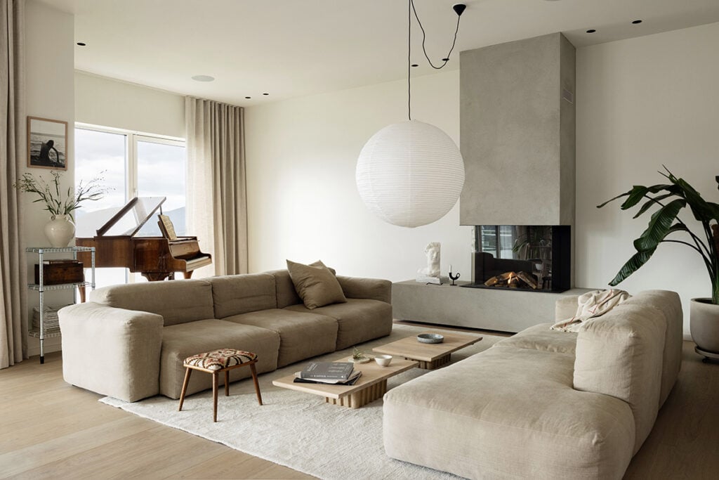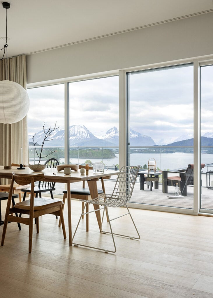 Lugn och balans är nyckelord. Med en spektakulär utsikt som levande konst precis utanför fönstret har det varit naturligt att välja neutrala färger för de stora ytorna. Vitt, beige och brunt går igen som huvudfärger, med utvalda stänk av färger och mönster här och där, samt inslag av gröna växter. Material som använts är slitstarka och naturliga och tål att användas.