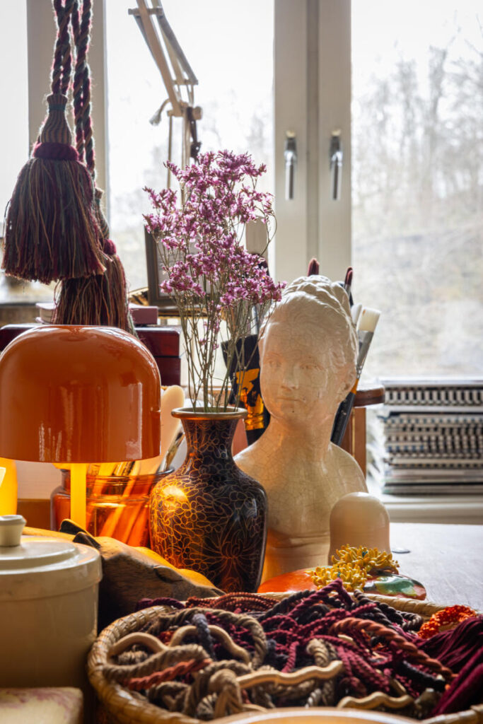 Det var viktigt att Amanda skulle ha ett helt rum för sitt skapande i den nya lägenheten. Där får hennes textilier, ramar, böcker, konst samt sy- och målartillbehör stå framme, ta plats och inspirera – något som inte var möjligt i det tidigare hemmet.