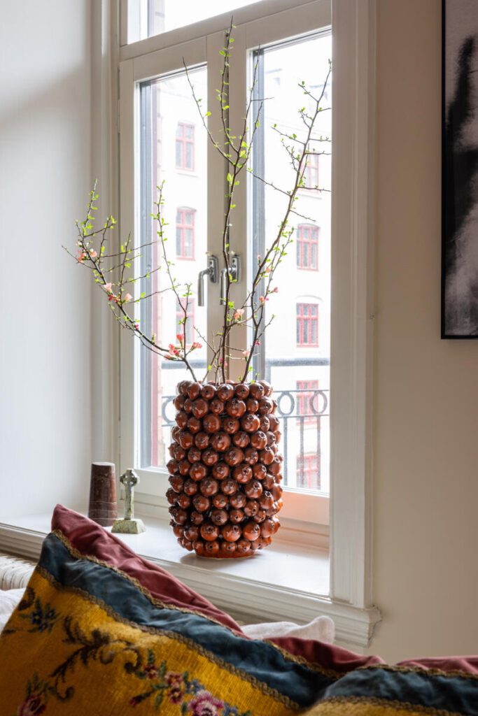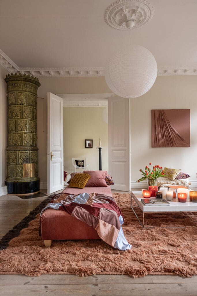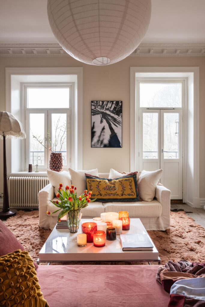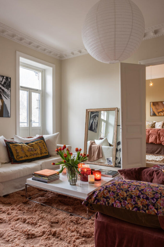 Mitt i centrala Göteborg ligger Amanda och Pauls magnifika lägenhet. Den generösa takhöjden, de vackra takstrukturerna och de eleganta dubbeldörrarna som binder ihop de olika rummen, skapar en luftig känsla trots att hemmet är väl fyllt av konst, vackra föremål och textilier.
