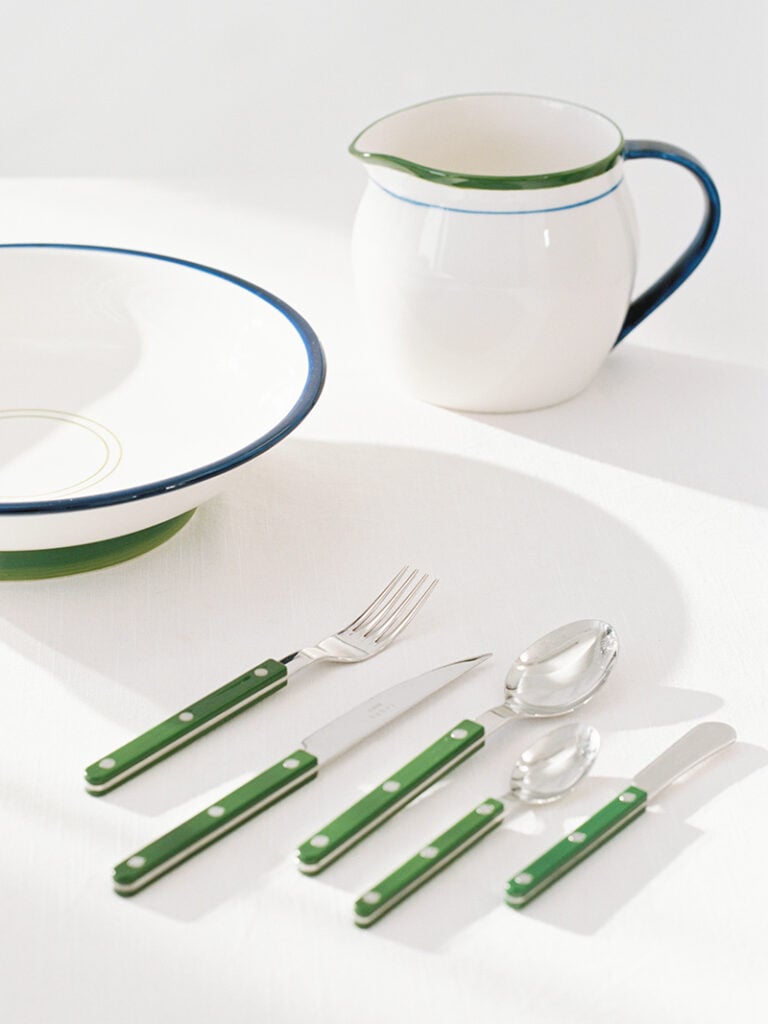 - Glas, porslin och bestick i rosa, grönt och blått.