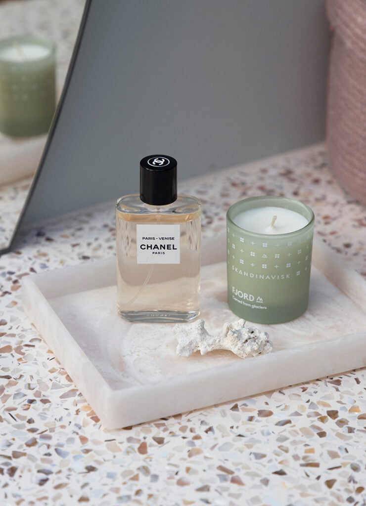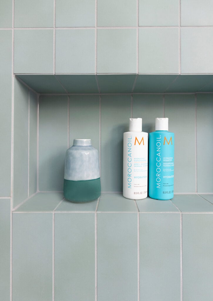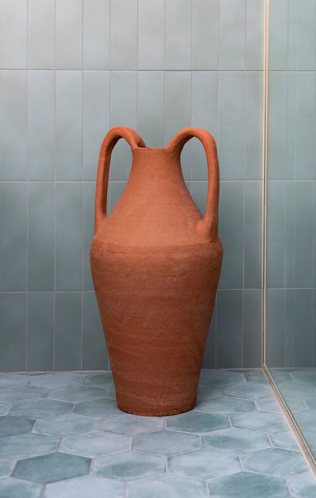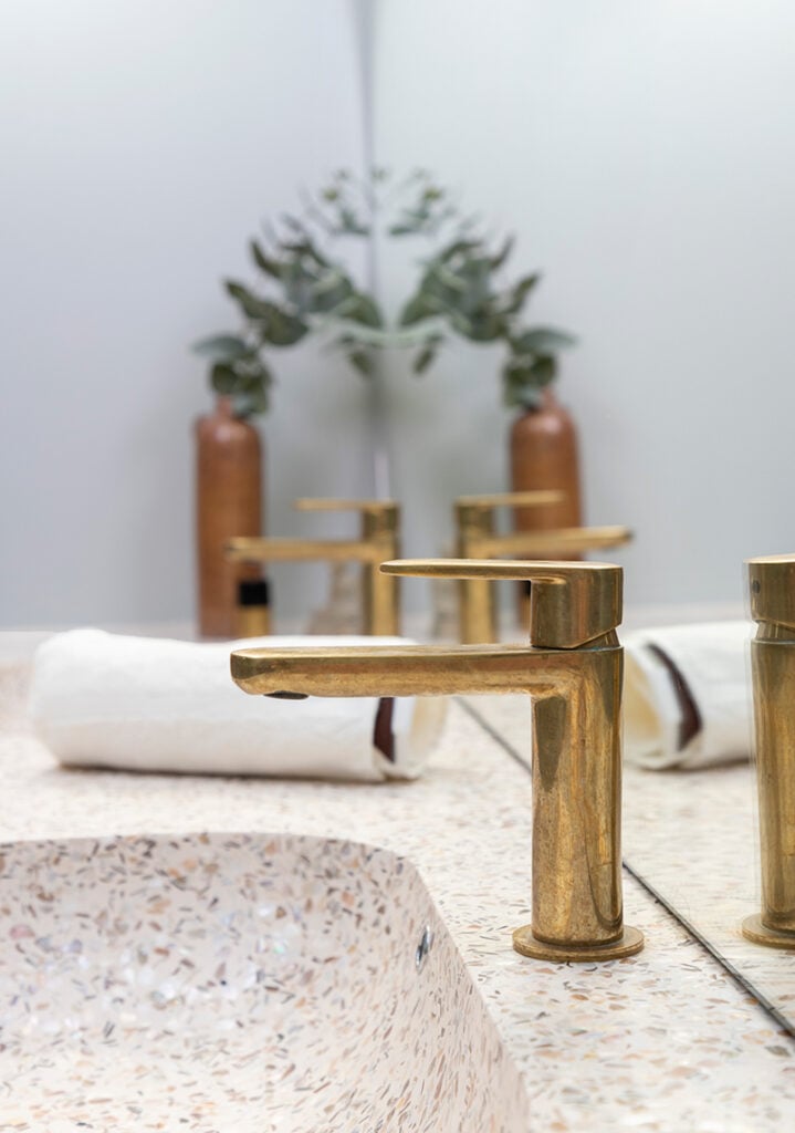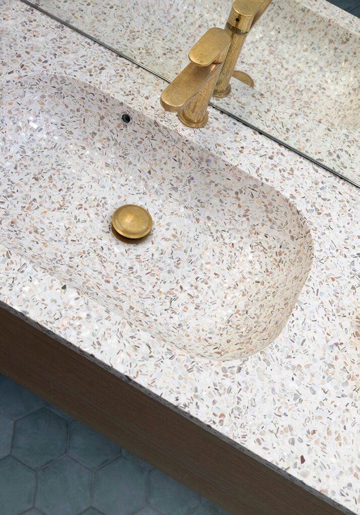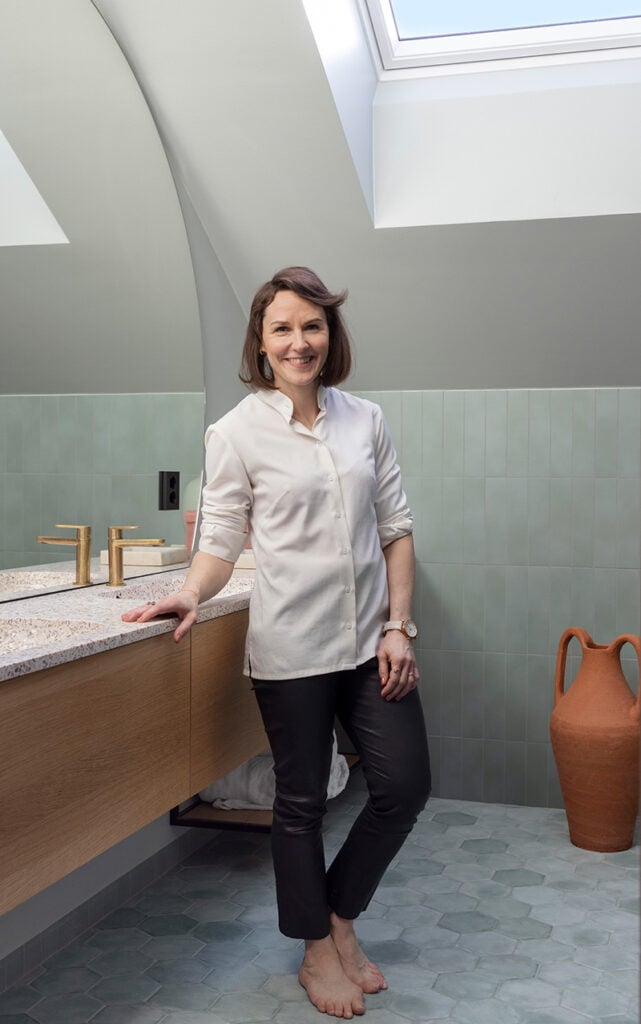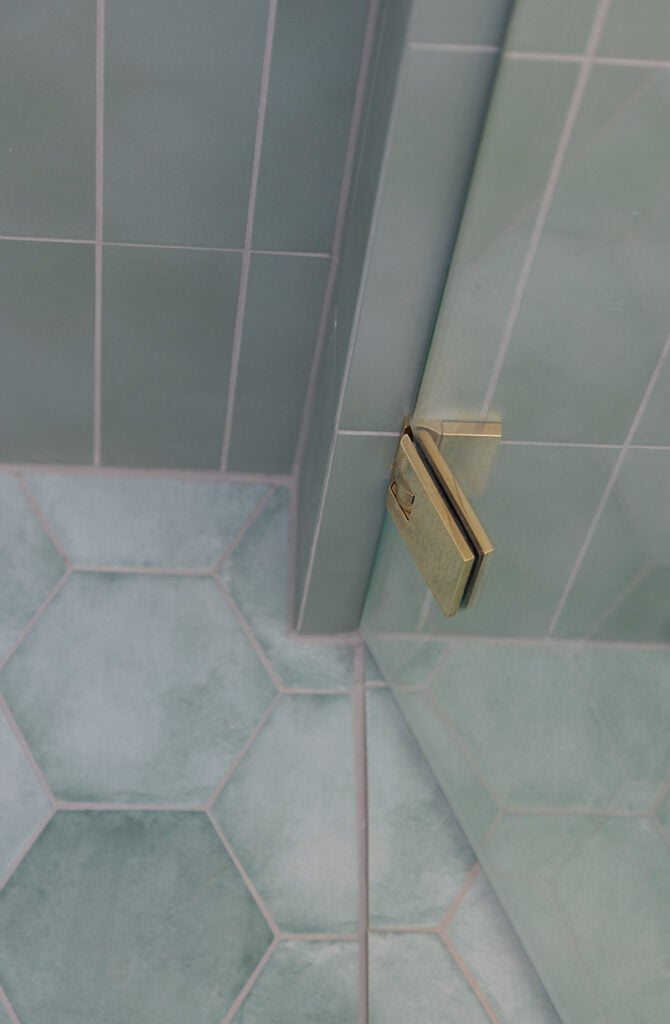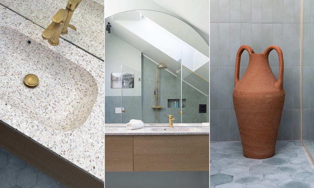 – Vi gillar att leka med kalla och varma färger och material för att skapa en fin balans. Som när armaturerna i oxiderad mässing står i kontrast till de svala kakelplattorna.