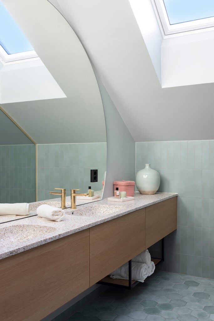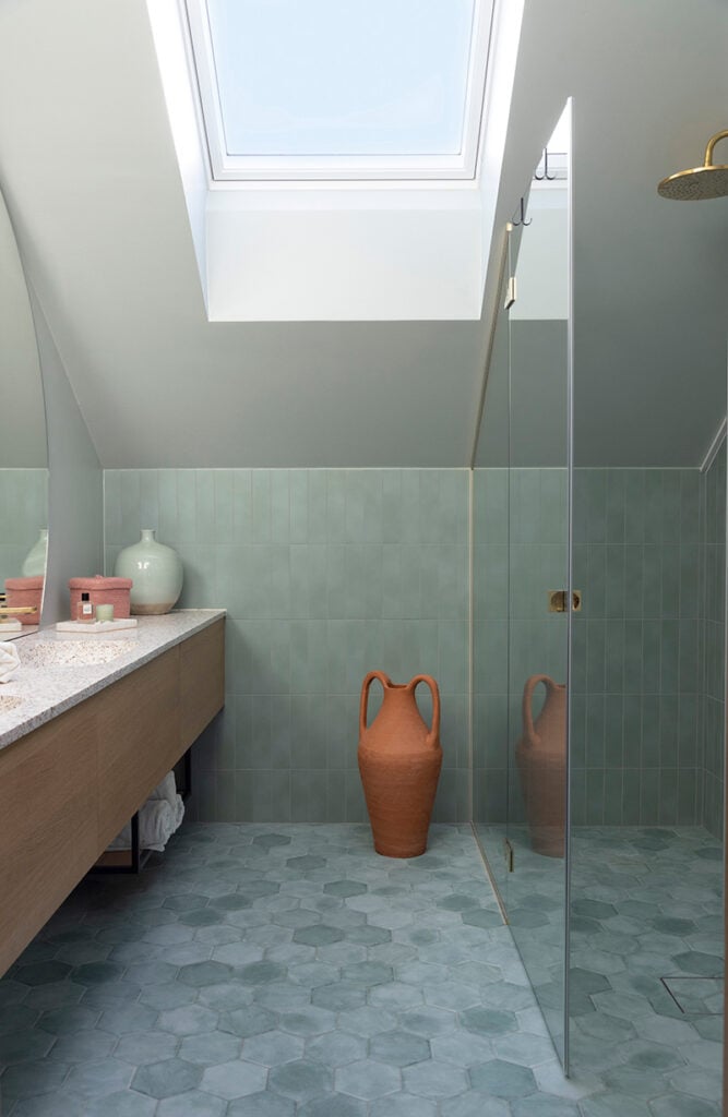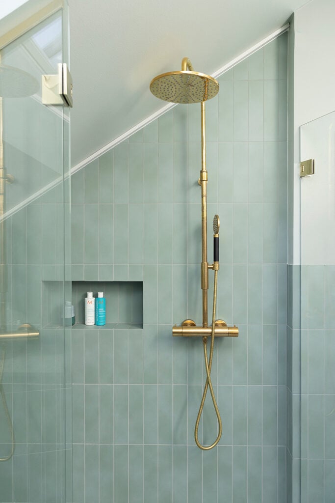 – Det är inte bara att placera in ett handfat, en dusch och en toalett. Vi ville att det också skulle vara ett härligt rum att komma in i, och eftersom det har ett snedtak var ytan tvungen att utnyttjas extra väl.