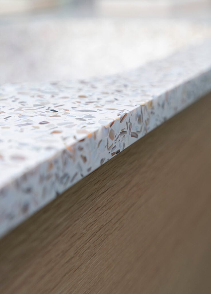 De två ovala handfaten tar upp den mjuka formen igen, och dessa är utformade i ett vackert kompositmaterial som sömlöst övergår i bänkskivan runt omkring.