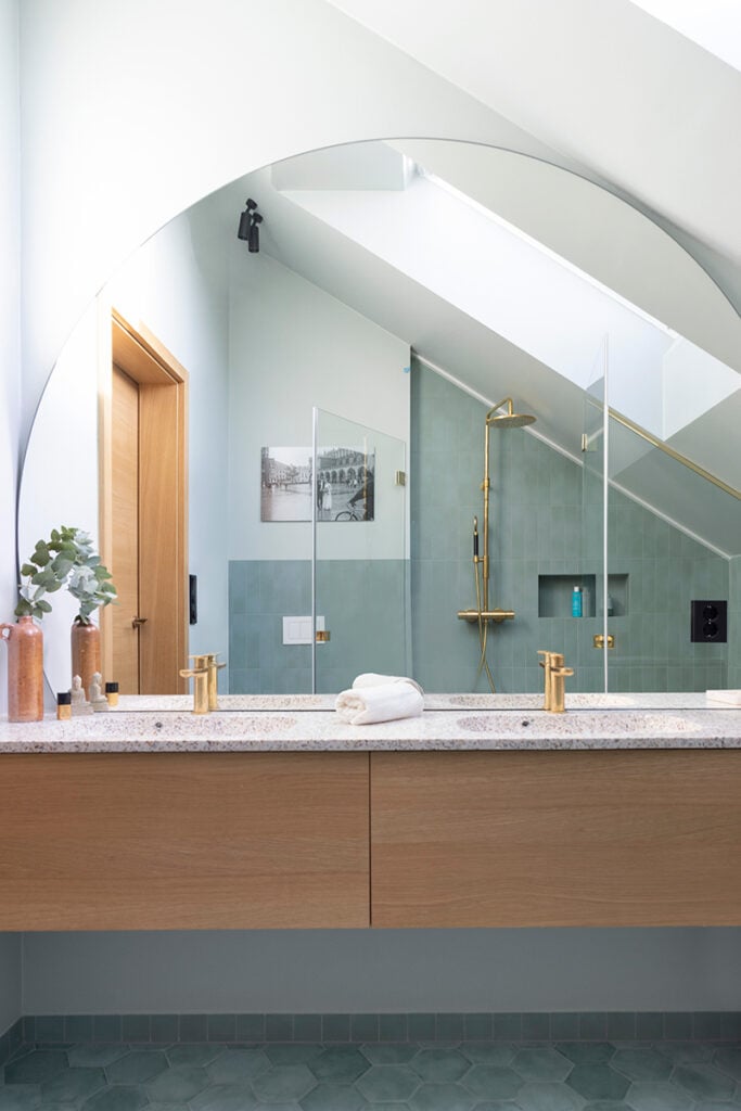 Med en spegel som ger en riktig wow-effekt, handplockade kakelplattor och genomtänkta lösningar skapades ett drömbadrum på den begränsade ytan under snedtaket.
