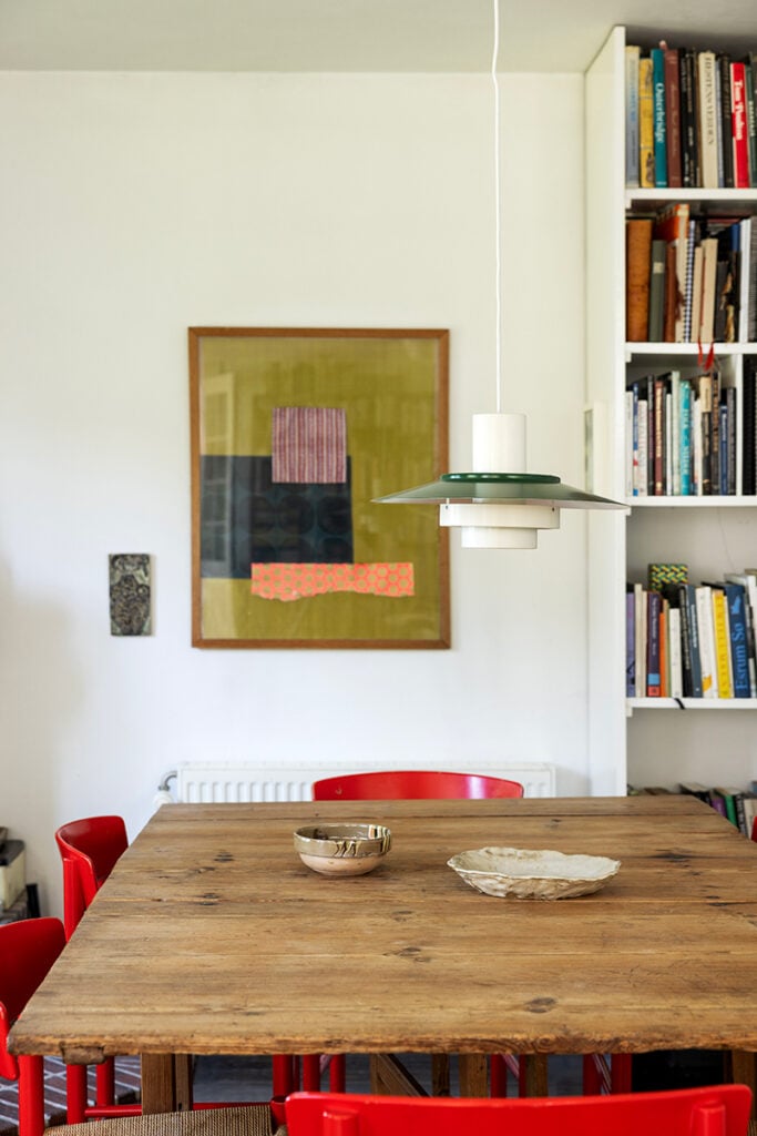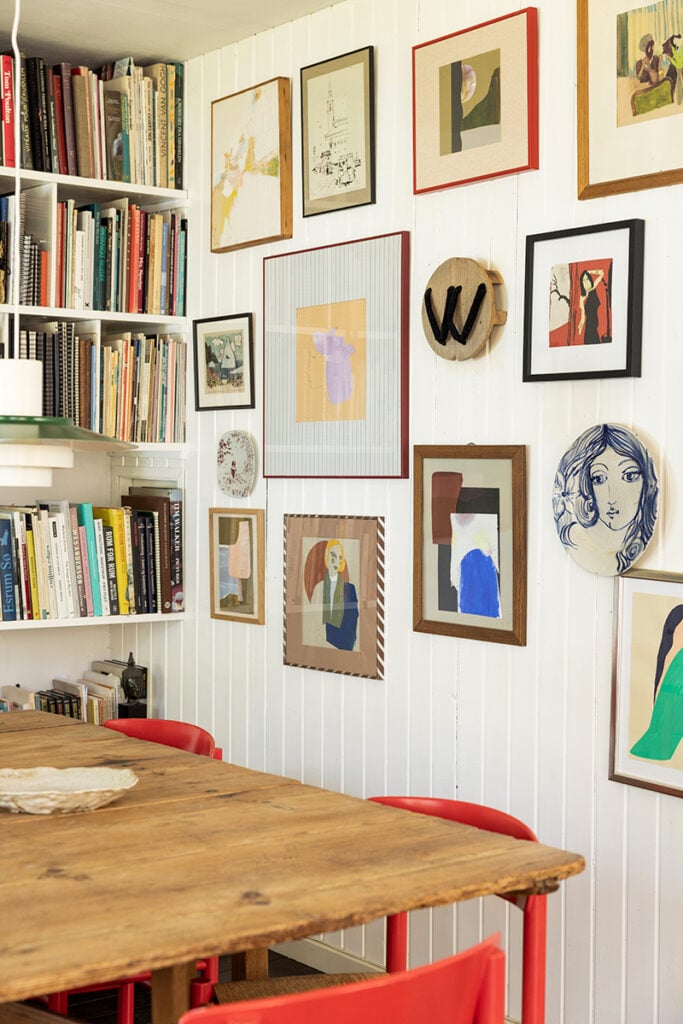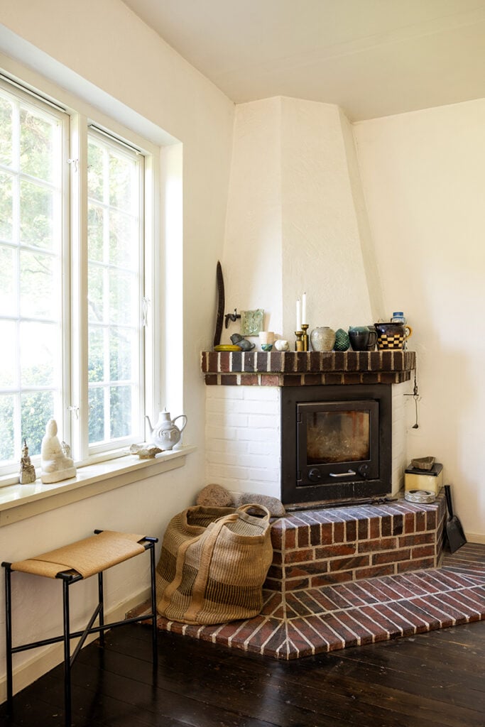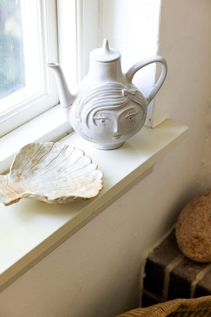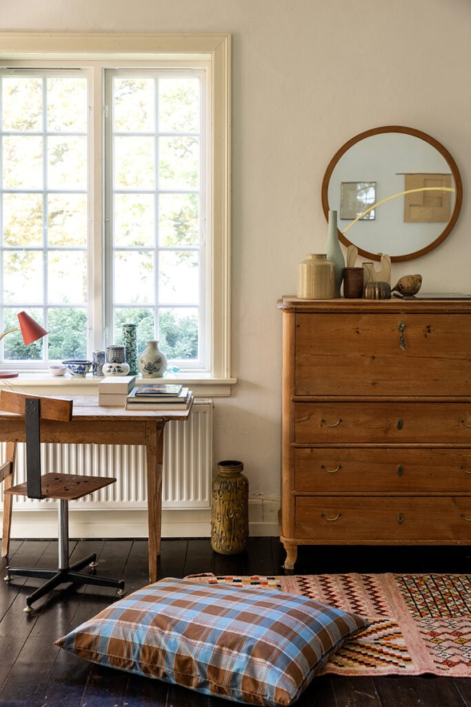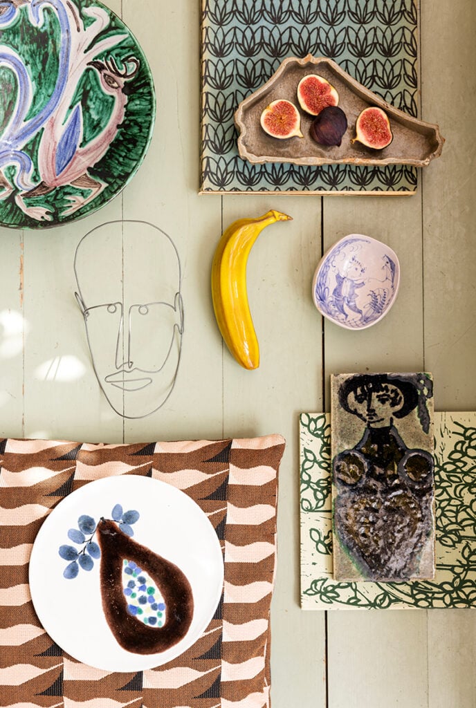 Inredningen är en blandning av konst, keramik och ärvda eller begagnade möbler. Med stor omtanke och en smula nytänk har konstnären Souvanni Asmussen tagit hand om sitt barndomshem.