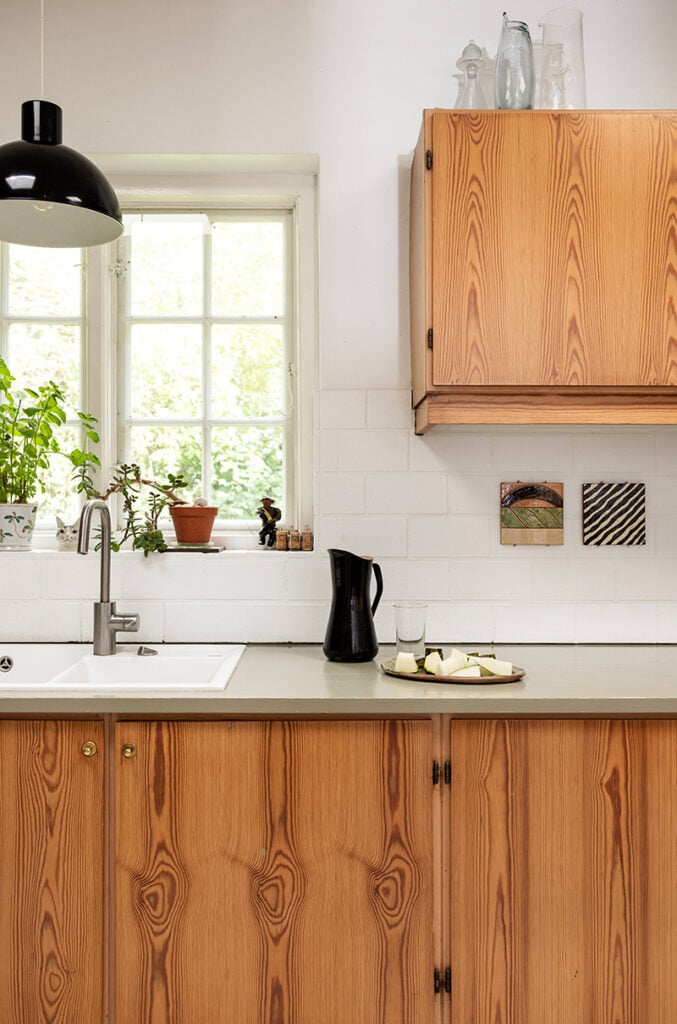 – Vi har alltid haft stor respekt för allt som är original, eftersom det är det mest hållbara och estetiska. Så det var ingen tvekan om att vi ville behålla köket, det har en historia och formmässigt tycker jag att det är helt fantastiskt. Jag funderade ett tag på att måla alla fronter, men tack och lov släppte jag den idén i sista minuten. Lösningen blev i stället att lätta upp utrymmet genom att måla kaklet och golvet vitt, säger Souvanni.