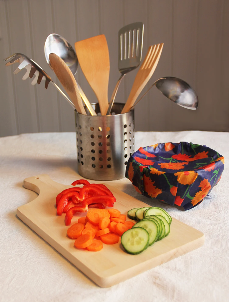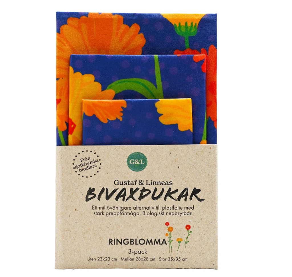 Istället för plastfolie kan dukar i bomull och bivax användas för matförvaring. De formas med handvärme som lock över skålar och annat. Från Gustaf & Linnea kommer några bivaxdukar i fina mönster, bland annat med ringblommor i glada färger.