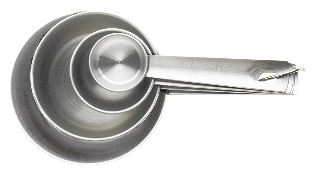 Plus: Rostfri och hållbar måttsats med tesked, matsked, hel och halv deciliter. Lätt och tunn med rundad form. Kan staplas, och fästas i metallring. Tål maskindisk.