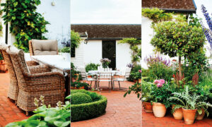 Den här uteplatsen är den perfekta förlängningen av huset – med två fina platser att sitta på och en terrass med rött tegelgolv.