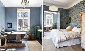 I den vackra sviten med tillhörande badrum på Villa Strömsfors är förr och nu i total balans. Den bohemiska tapeten har fått sätta karaktär på inredningen och skapar tillsammans med det rustika badkaret, den lite medfarna spegeln och de pampiga handfaten en ombonad stämning.